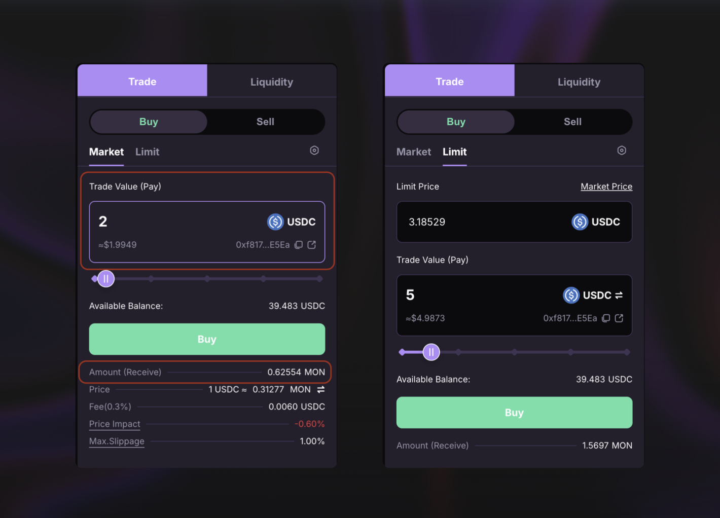 In the spot UI, pick the pair you want to trade: anything from MON/USDC and WETH/WBTC to the newest memecoins, gamefi, or RWA tokens.